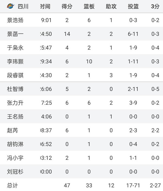 这场比赛,四川男篮真是刷新了职业球队的下限,全队12人,有11人上场,结果就景菡一1人得分上双,其他人的命中率完全可以用惨不忍睹来形容,下面是本场比赛四川队的赛后数据:全场投篮71次,但是只命中17球,命中率仅为23.9%,其中球队三大首发于枭永投篮9中1,李玮颢投篮11中1,段睿骐9中1,三大主力合计29中3,命中率刚过10%。此外,四川这场全队三分27中2,命中率仅为7.4%,要知道,很多都是空位三分,结果就投出这样的命中率,着实有些离谱。