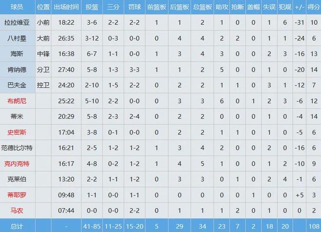 既然文班亚马如此大杀四方,自然就说明了没有东契奇&里夫斯&詹姆斯的湖人在马刺面前根本没有还手之力,108-136大比分落败。