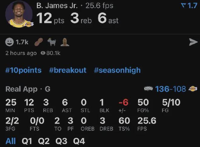 值得一提的是,“太子爷”今年以来,三分球合计8中6,命中率达到75%湖人队内最高。