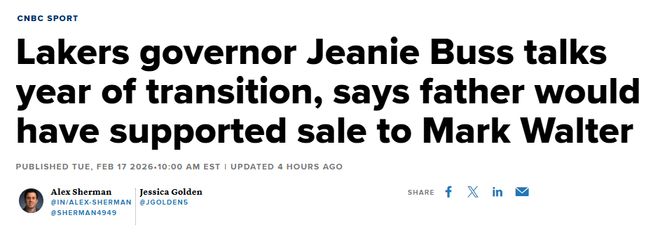 北京时间2月18日,现任湖人股东之一的珍妮-巴斯表示,新任大股东马克-沃尔特的资金实力将帮助球队与联盟顶级球队竞争,她还称已故父亲杰里-巴斯会支持这次股权出售。