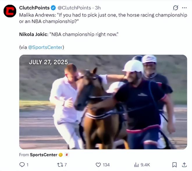 记者还询问约基奇,如果是你的赛马冠军与NBA冠军你选择哪一个?约基奇表示:如果是现在的话选NBA总冠军。(此前约基奇在自己的马夺冠后流泪,他谈到詹姆斯退役后自己不仅不会哭,连伤感都不会有)