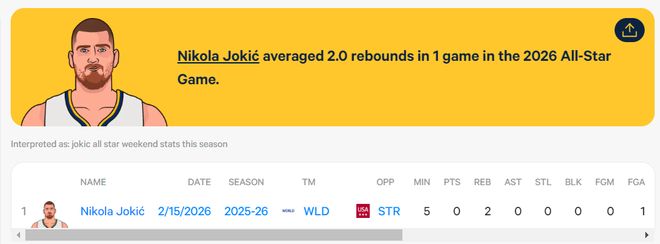 尼古拉-约基奇作为全明星先发,他是世界队的第一核心,结果他仅在第一场VS美国星队的比赛中登场5分05秒,1中0,怒砍0分2篮板0助攻,正负值-3。在第二场对阵美国条纹队的比赛直接被拉贾科维奇DNP了。