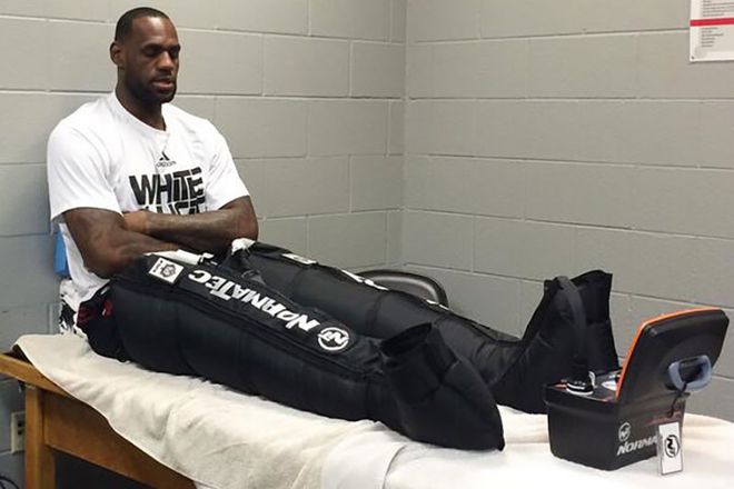 在湖人主场的一场比赛结束后,詹姆斯慢慢穿上冰浴足套,先把左脚、再把右脚浸入为他准备好的冰桶。他合作多年的私人训练师兼运动表现教练迈克-曼西亚斯,随后用冰袋裹住他的双膝和背部。