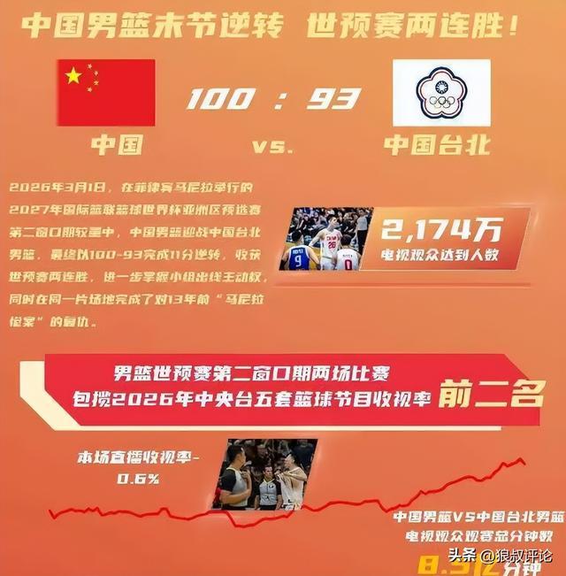 北京时间3月5日,根据中国篮协官方社媒的发文,2027国际篮联篮球世界杯第二窗口期,中国男篮客场逆转日本,中国台北的比赛,深受外界的关注,电视转播人数更是屡创高峰。