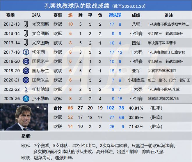熟悉孔蒂的球迷应该不会对那不勒斯的出局感到意外。“单线之王”的另一种叫法是“内战内行,外战外行”。话说给你一分钟,你能说出孔蒂的球队在欧的代表作吗?不能?这就对了,查了数据我也不能。