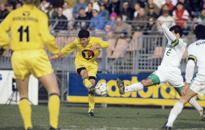 齐达内:这是在戛纳,那时候我还有头发(笑)。我在法甲主场对阵南特的第一粒进球(1991年2月10日,2-1)。我在法甲的第一场比赛也是对南特,不过是在客场拉博若瓦球场(1989年5月20日,1-1)。我在比赛还剩十分钟时替补登场。那时候每队只有两名替补。我和博罗-普里莫拉茨一起坐在替补席上。是让-费尔南德斯派我上场的。